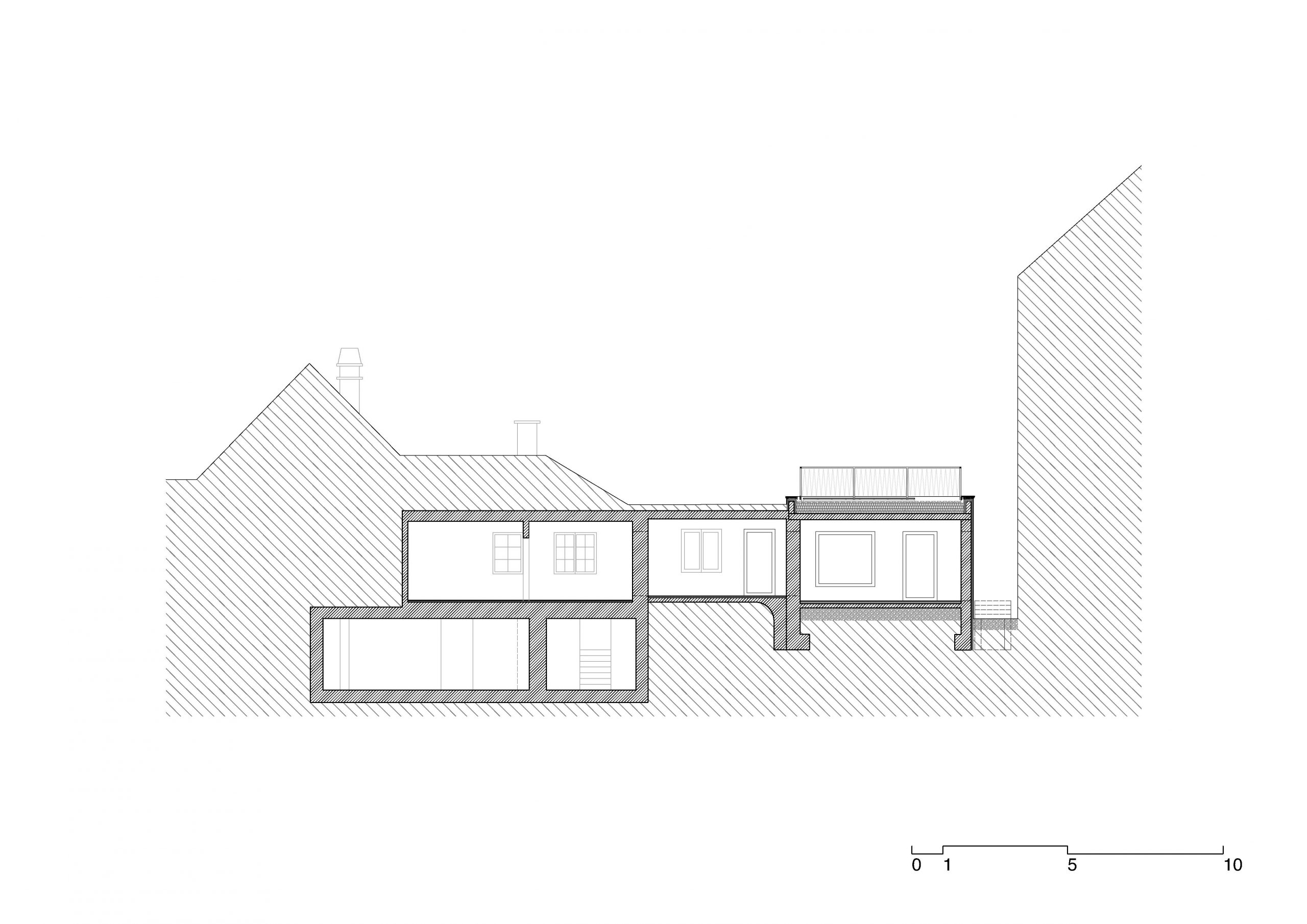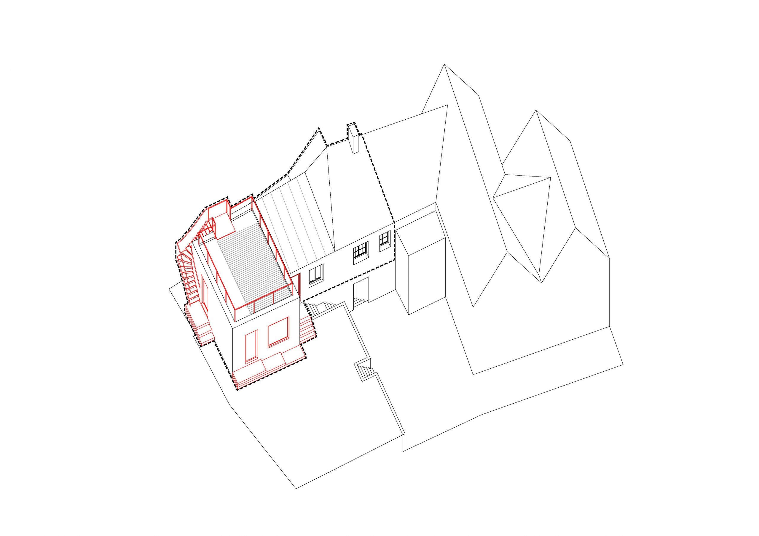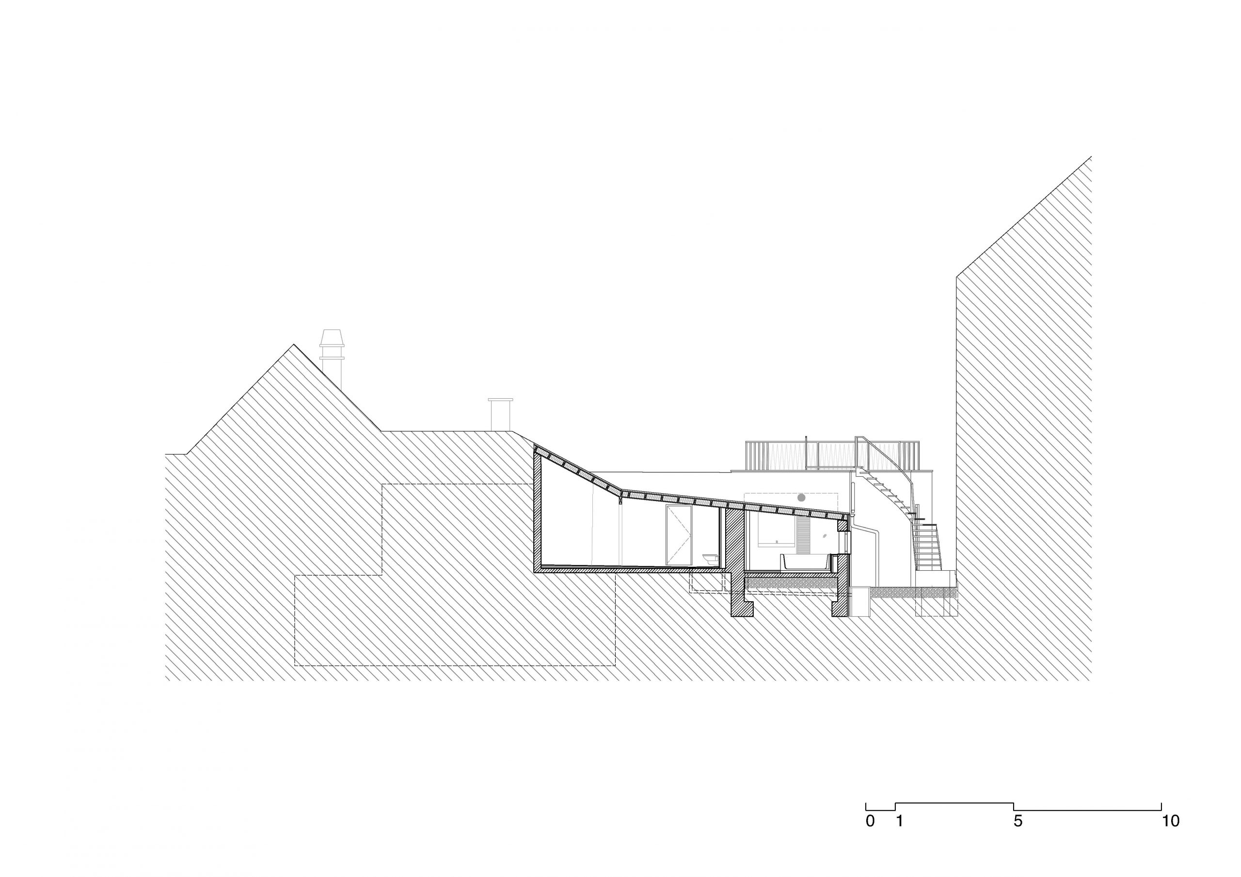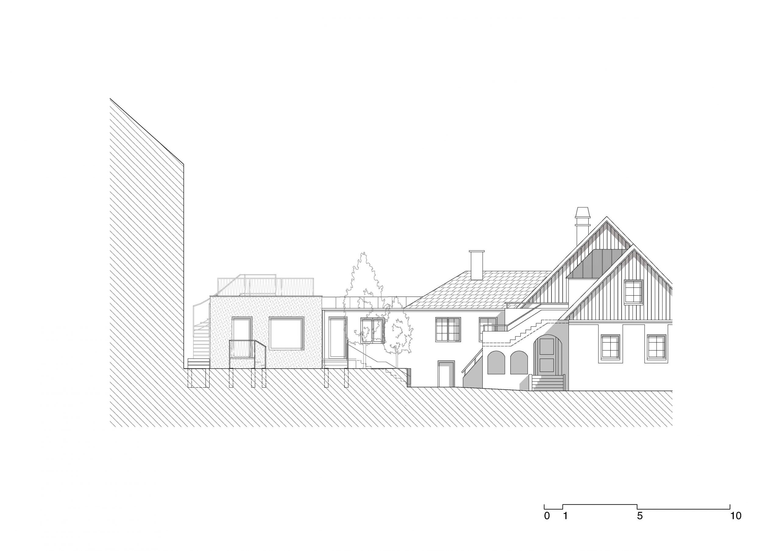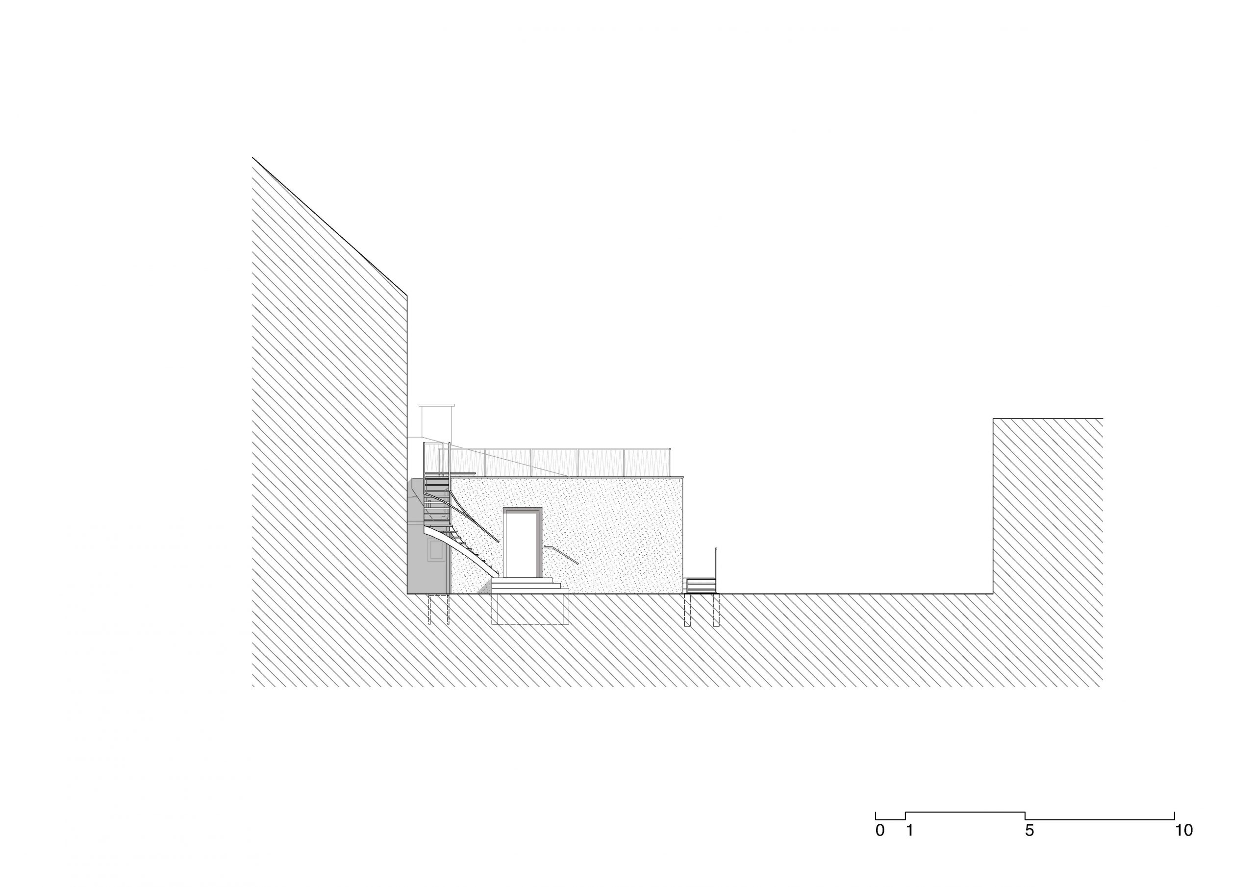 Das bestehende Flachdach wird nach einer Sanierung als Dachterrasse genutzt. Auf dem Eingangspodest aus Stahlbeton sitzt eine eine Außenstiege aus Stahl. Eine 1m hohe Brüstung entlang der Attika dient der Absturzsicherung.