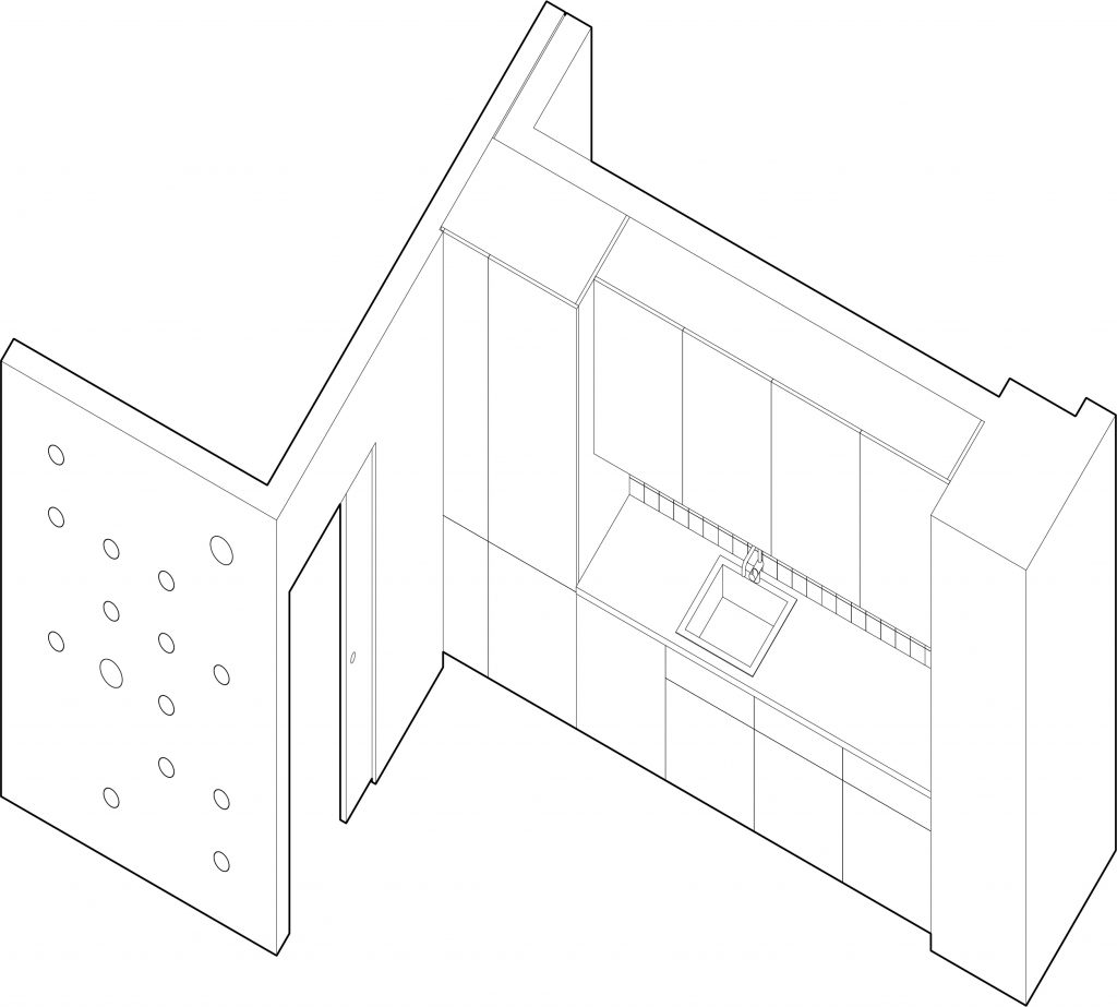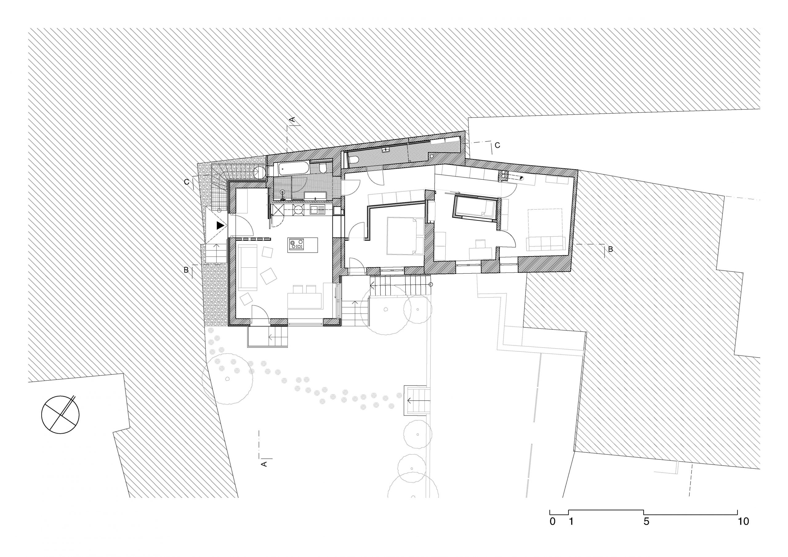 Um den erworbenen Altbaubestand (errichtet in mehreren Phasen von 1985-2004) nutzbar zu machen, wurde die Eingangstür auf die Westseite verlegt. Über die Wohnungstür gelangt man in einen Vorraum. Von hier aus betritt man die Wohnküche. Über die in den nördlichen Bereich der Wohnung angeordnete Erschließungszone können nun alle Zimmer separat erschlossen und somit genutzt werden. Das Bad bleibt unverändert. Der Abstellraum wurde durch ein zusätzliches WC ergänzt.